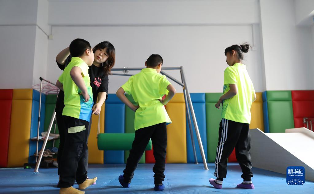 5月19日,莊巖帶著(zhù)學(xué)生在感統教室內進(jìn)行感覺(jué)統合訓練。