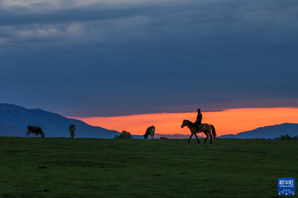 5月20日,夕陽(yáng)下的那拉提草原上,牧民騎馬牧歸。