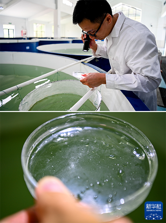 這是一張拼版照片,5月20日,科研人員在廣西大藤峽水利樞紐工程魚(yú)類(lèi)增殖放流站觀(guān)察魚(yú)苗的生長(cháng)情況。