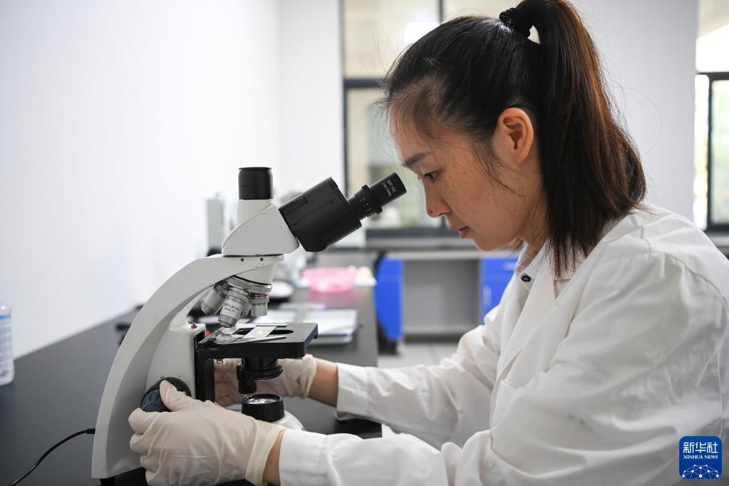 5月20日,科研人員在廣西大藤峽水利樞紐工程珍稀魚(yú)類(lèi)保育中心的實(shí)驗室內觀(guān)察野生魚(yú)的生物樣本。
