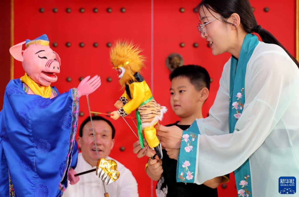 5月21日,在山東青島,萊西木偶藝術(shù)團的演員給小朋友演示木偶戲表演技巧。