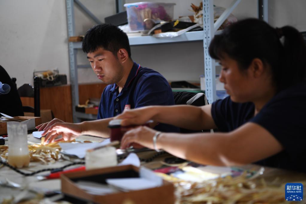 5月17日,張富揚(左)在非遺傳習基地制作蘆葦畫(huà)。