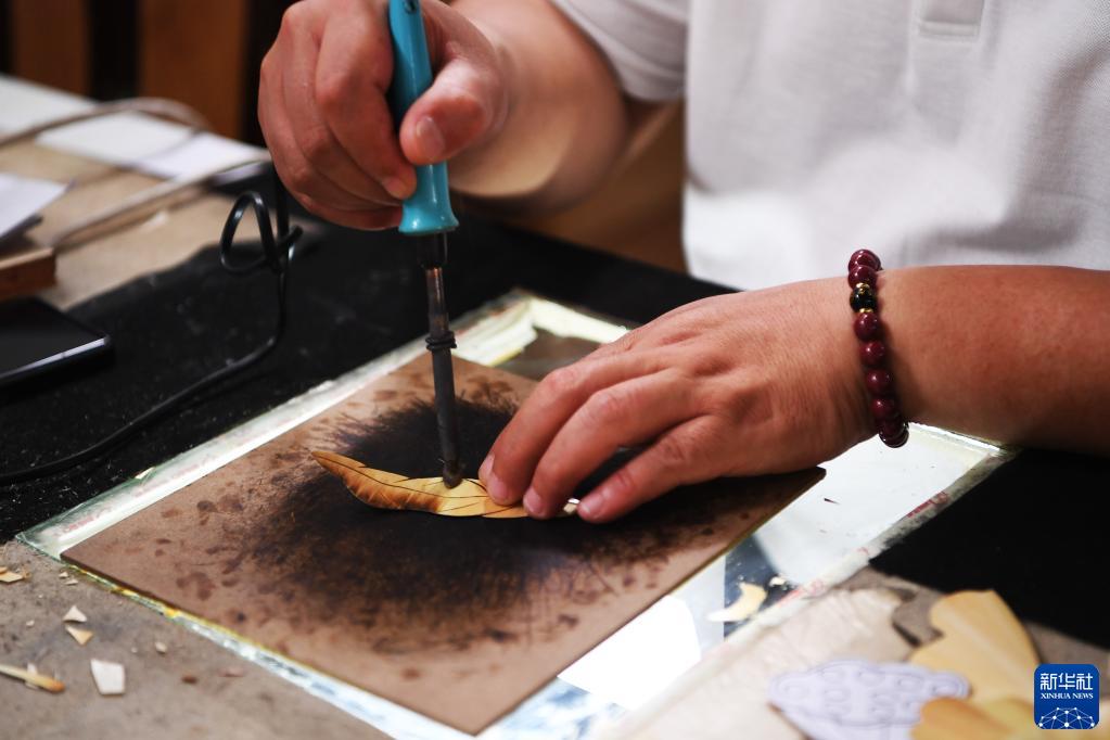 5月16日,葛磊在非遺傳習基地制作蘆葦畫(huà)時(shí)進(jìn)行烙燙。