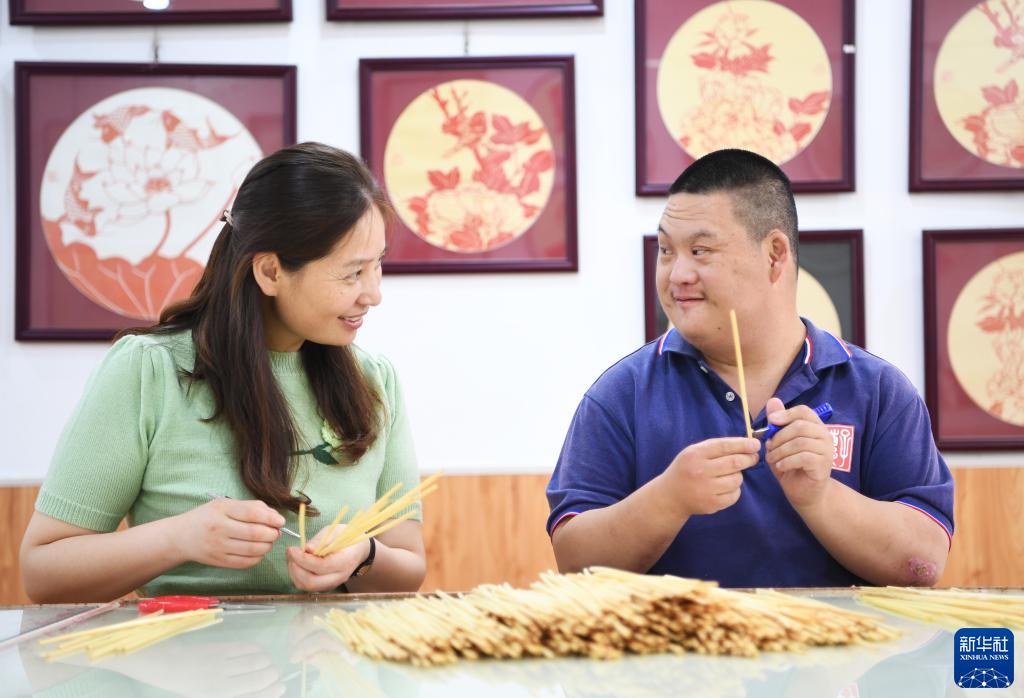 初夏的風(fēng)吹過(guò),河南省周口市淮陽(yáng)區龍湖里的叢叢蘆葦隨之搖曳。在淮陽(yáng)區一家非遺傳習基地,20歲的張富揚忙著(zhù)將帶有荷花圖樣的蘆葦皮拼貼成片,他的左右手起起伏伏,燈光也隨之忽明忽暗。他眼神專(zhuān)注、動(dòng)作熟練,只有一旁的拐杖,才會(huì )讓人注意到他腿部的異樣。