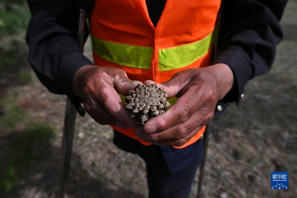護林員馬裕拿著(zhù)從林間撿來(lái)的松塔,這里很多松樹(shù)都是馬裕剛參加工作時(shí)種下的,如今已枝繁葉茂(5月17日攝)。