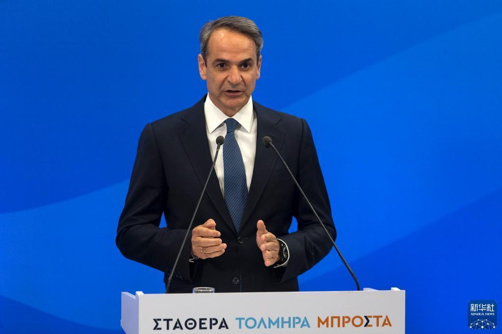 5月21日晚,希臘新民主黨主席、政府總理米佐塔基斯在雅典的新民主黨總部發(fā)表大選獲勝感言。