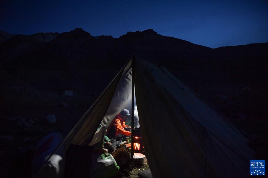 在珠峰登山大本營(yíng)附近搭建的帳篷里,牦牛工班丹燒水煮茶(5月17日攝)。