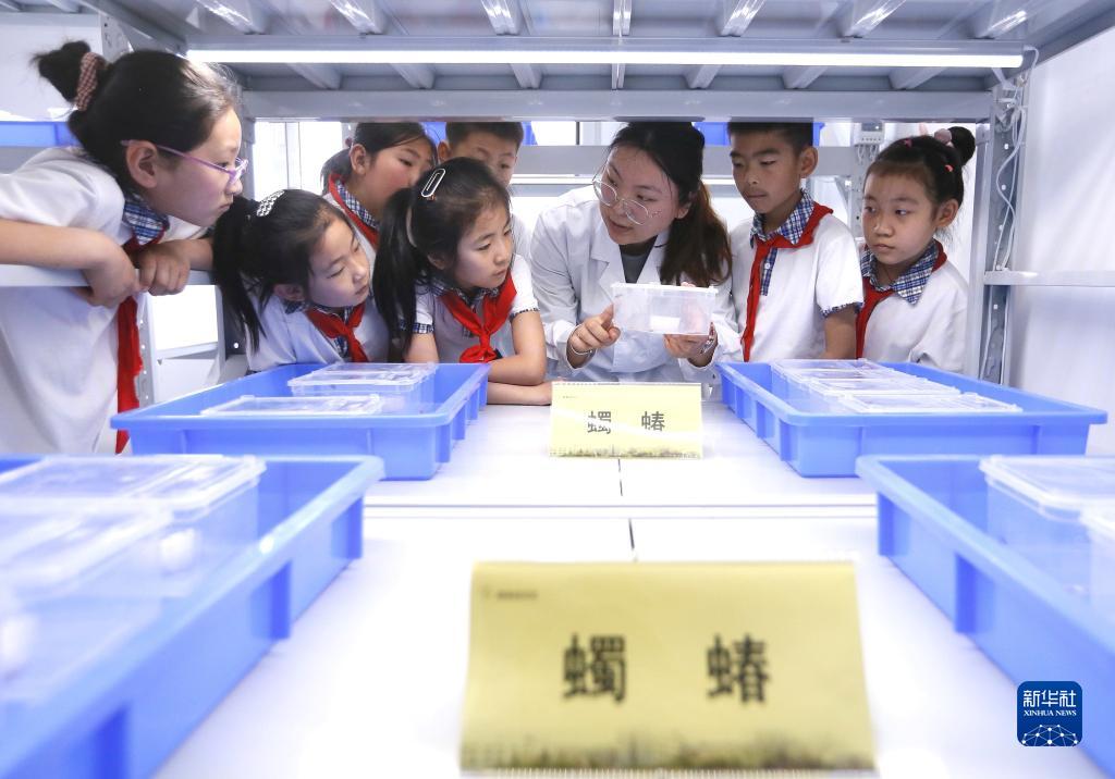 5月22日,在中國農業(yè)科學(xué)院青島特種作物研究中心試驗基地,工作人員為小學(xué)生講解農作物害蟲(chóng)綠色防控技術(shù)。