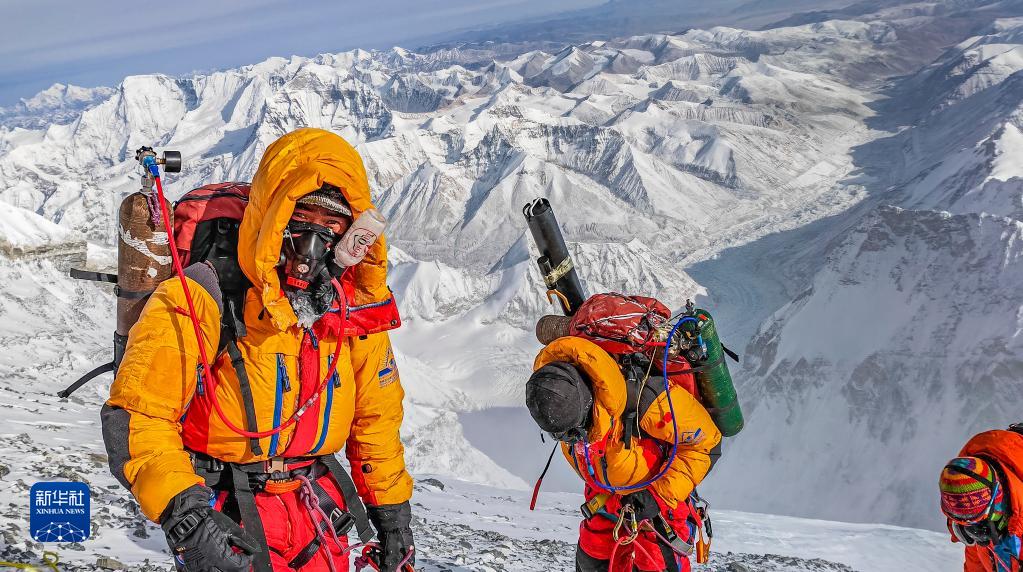 5月23日,2023年珠峰科考登頂隊員在沖頂。