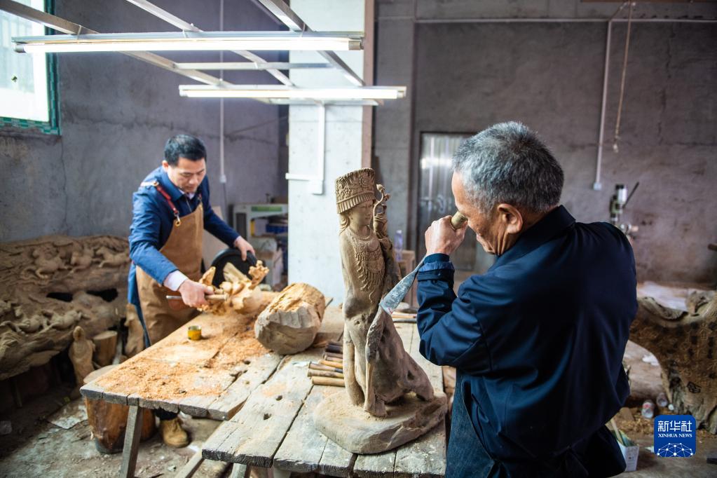 5月23日,在洞口縣巖山鎮陽(yáng)家山村,洞口木雕非遺傳承人傅立先(左)和父親傅金林在創(chuàng )作木雕作品。