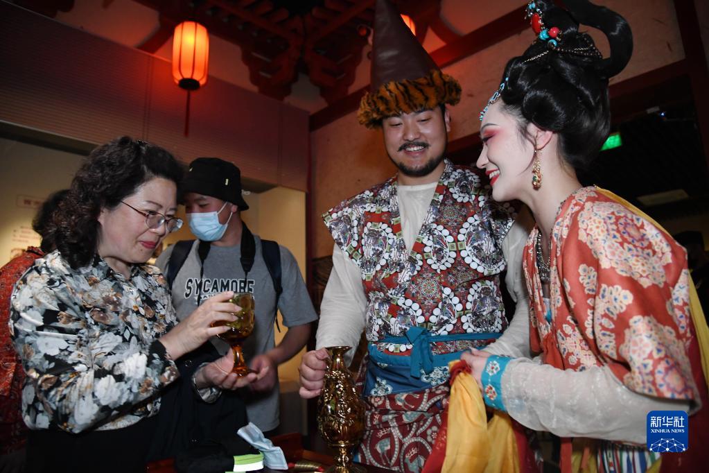 5月22日晚,在西安博物院《長(cháng)安有故里——絲路少年大唐行》展覽上,身著(zhù)復原唐裝的演員與游客互動(dòng)。