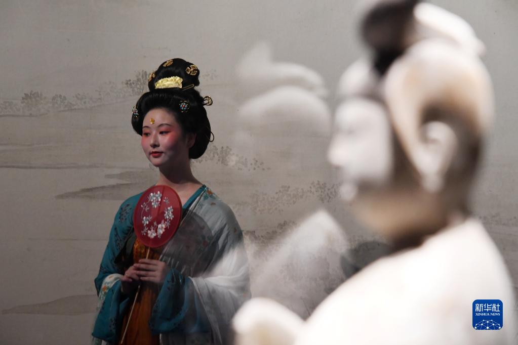 5月22日晚,在西安博物院《長(cháng)安有故里——絲路少年大唐行》展覽上,演員為游客呈現唐朝服飾。