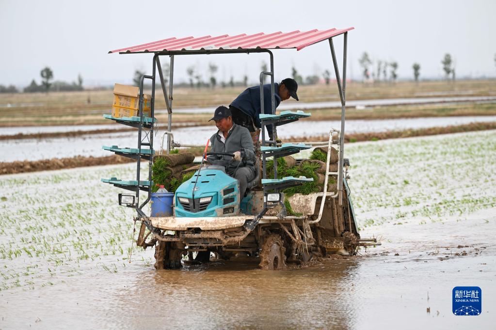 5月23日,達拉特旗昭君鎮村民在鹽堿地改良水稻田中使用農機插秧。