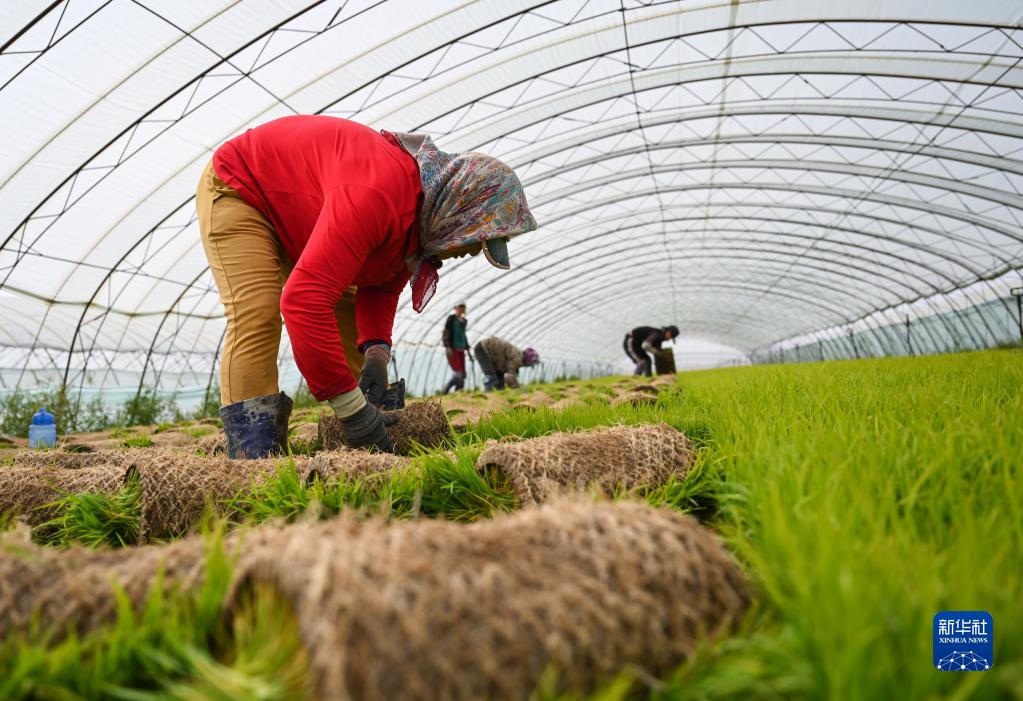 5月23日,達拉特旗昭君鎮村民在育秧苗大棚中起秧。