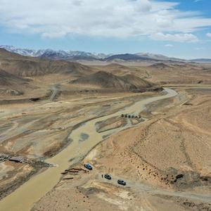 科考隊員在新疆東昆侖庫木庫里盆地古爾嘎赫德河進(jìn)行水文巡測工作(5月22日攝,無(wú)人機照片)。