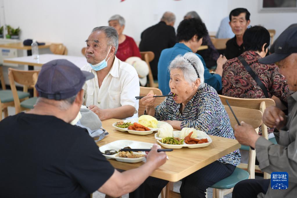 河北雄安新區容東片區南文營(yíng)社區居民在社區食堂就餐(5月23日攝)。