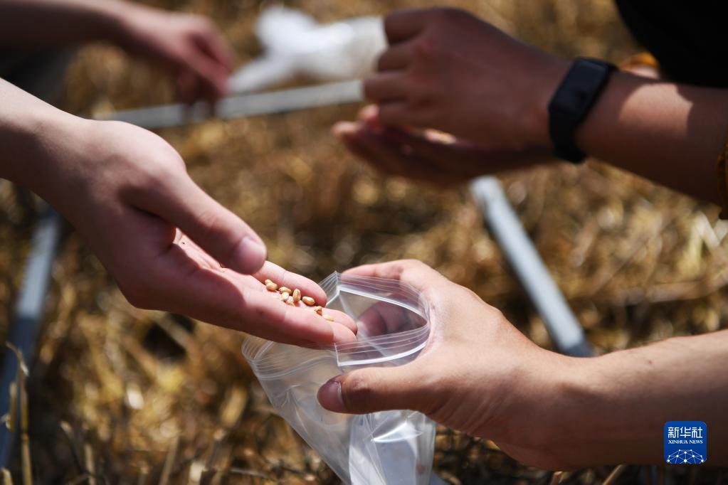 5月24日,在河南省南陽(yáng)市唐河縣的活動(dòng)現場(chǎng),工作人員在選定的采樣區域撿拾掉落的麥粒。