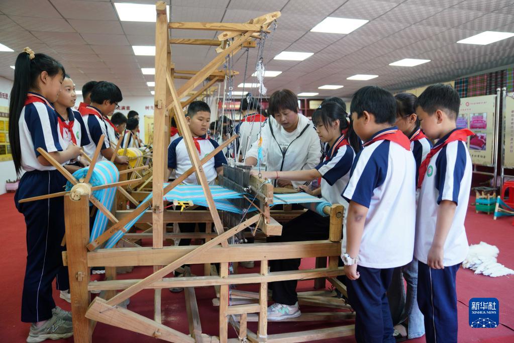 5月24日,小學(xué)生在河北省沙河市塔子峪村非遺傳習所內體驗四匹繒布制作技藝。