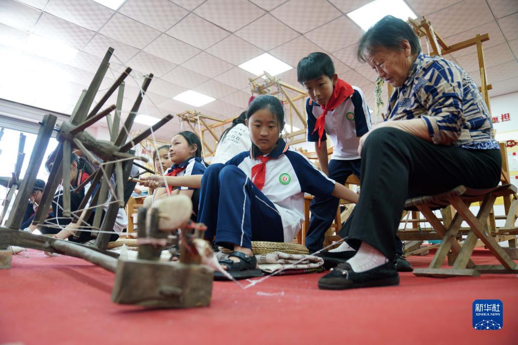 5月24日,小學(xué)生在河北省沙河市塔子峪村非遺傳習所內體驗四匹繒布制作技藝。