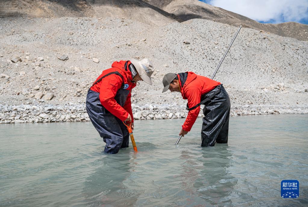 在珠峰登山大本營(yíng)附近,來(lái)自西藏大學(xué)生態(tài)環(huán)境學(xué)院的科考隊員在收集水生生物樣本(5月22日攝)。