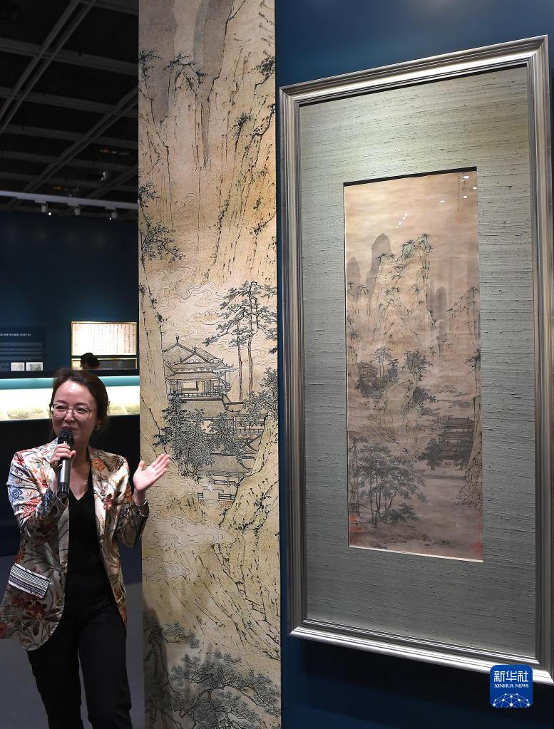5月24日,在香港會(huì )議展覽中心,工作人員講解拍品明代畫(huà)家仇英的作品《仙山樓閣》。新華社記者 陳鐸 攝