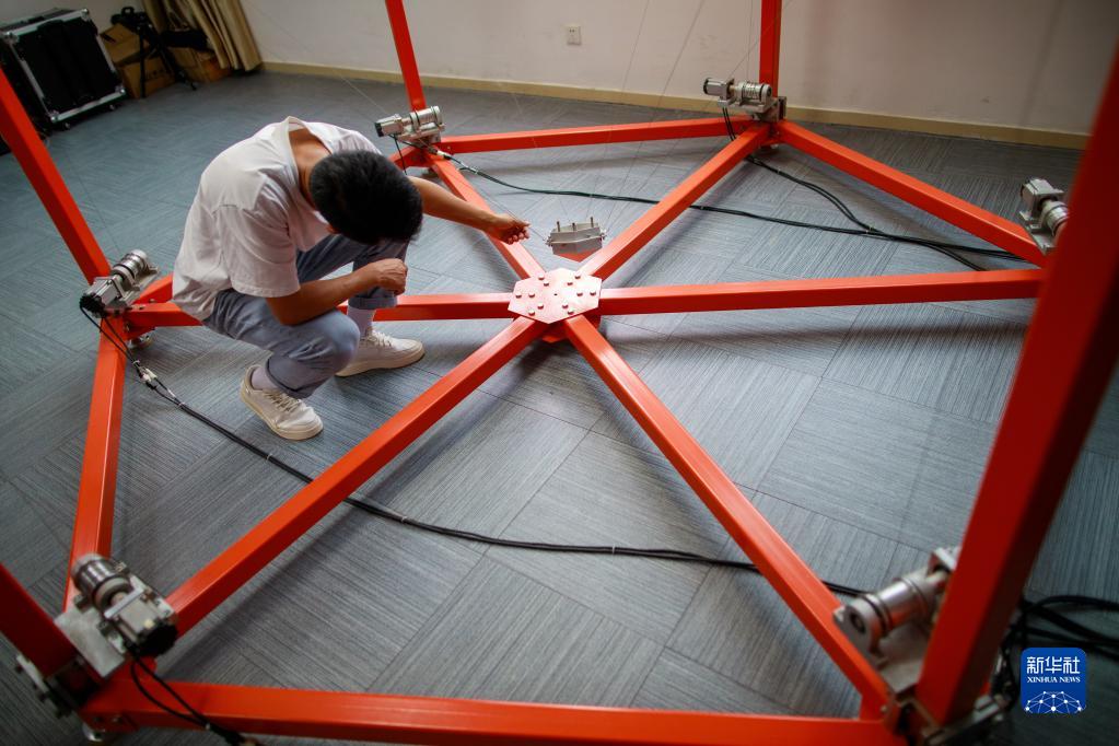 5月23日,工作人員在貴州大學(xué)省部共建公共大數據國家重點(diǎn)實(shí)驗室的“中國天眼”饋源艙模型前進(jìn)行研究。