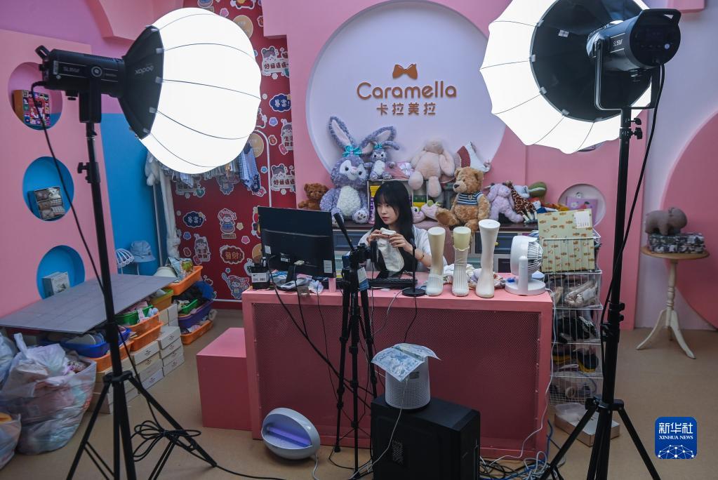 5月25日,在位于浙江省諸暨市大唐街道的浙江阿大互聯(lián)科技股份有限公司的襪業(yè)直播基地內,工作人員在進(jìn)行直播銷(xiāo)售。