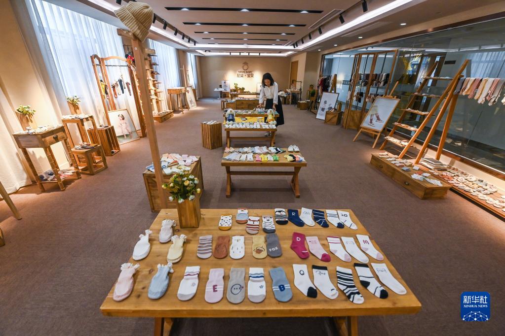 這是位于浙江省諸暨市大唐街道的友潤襪業(yè)有限公司的新款襪品展廳(5月25日攝)。