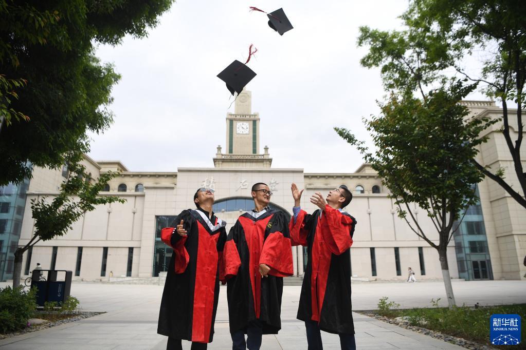 謝炎廷(中)和同學(xué)在蘭州大學(xué)圖書(shū)館前拍“畢業(yè)照”留念(5月10攝)。新華社記者 陳斌 攝