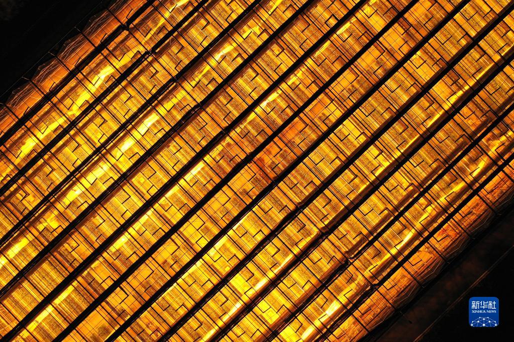 這是5月23日拍攝的貴陽(yáng)市開(kāi)陽(yáng)縣南江蔬菜良種繁育中心育苗大棚夜間補光場(chǎng)景(無(wú)人機照片)。補光更有利于種苗生長(cháng),縮短育苗周期。