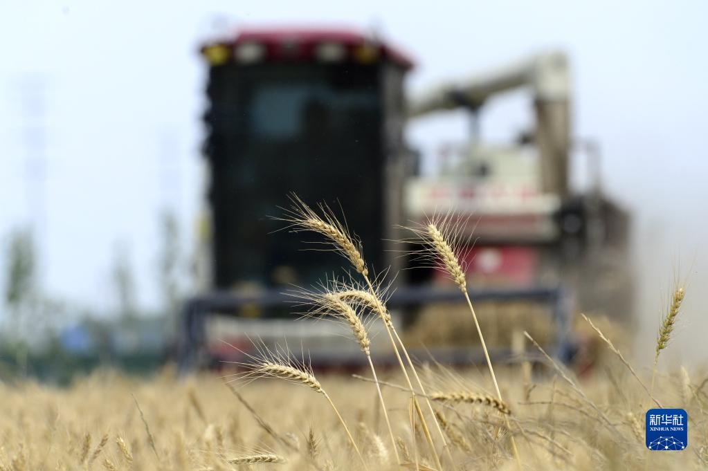 5月25日,農民在河南省駐馬店市汝南縣宿鴨湖街道十里鋪社區收獲小麥。