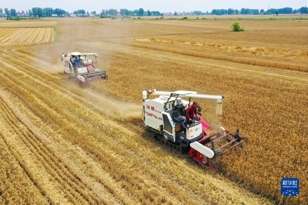 5月25日,河南省駐馬店市正陽(yáng)縣銅鐘鎮小李村的村民正在機收小麥。