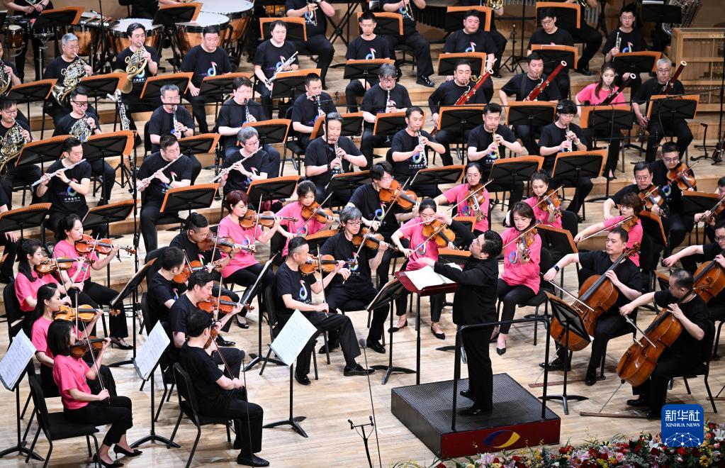 5月25日,在天津大劇院音樂(lè )廳,由天津歌舞劇院、天津交響樂(lè )團等組成的天津百人聯(lián)合樂(lè )團在舞臺上演奏。