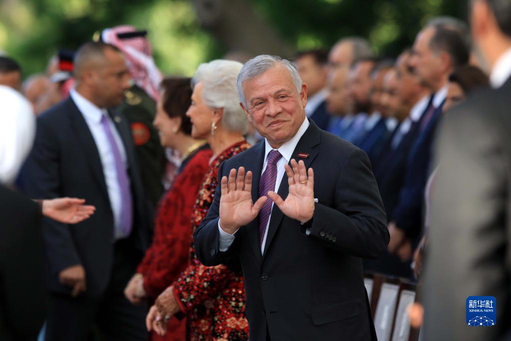 5月25日,在約旦首都安曼,約旦國王阿卜杜拉二世(中)參加獨立日慶典。