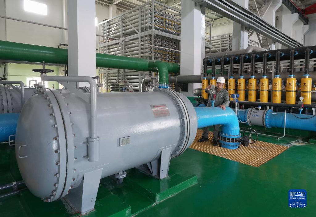 5月25日,工人在唐山市海港經(jīng)濟開(kāi)發(fā)區海水淡化項目投產(chǎn)的淡水生產(chǎn)車(chē)間工作。