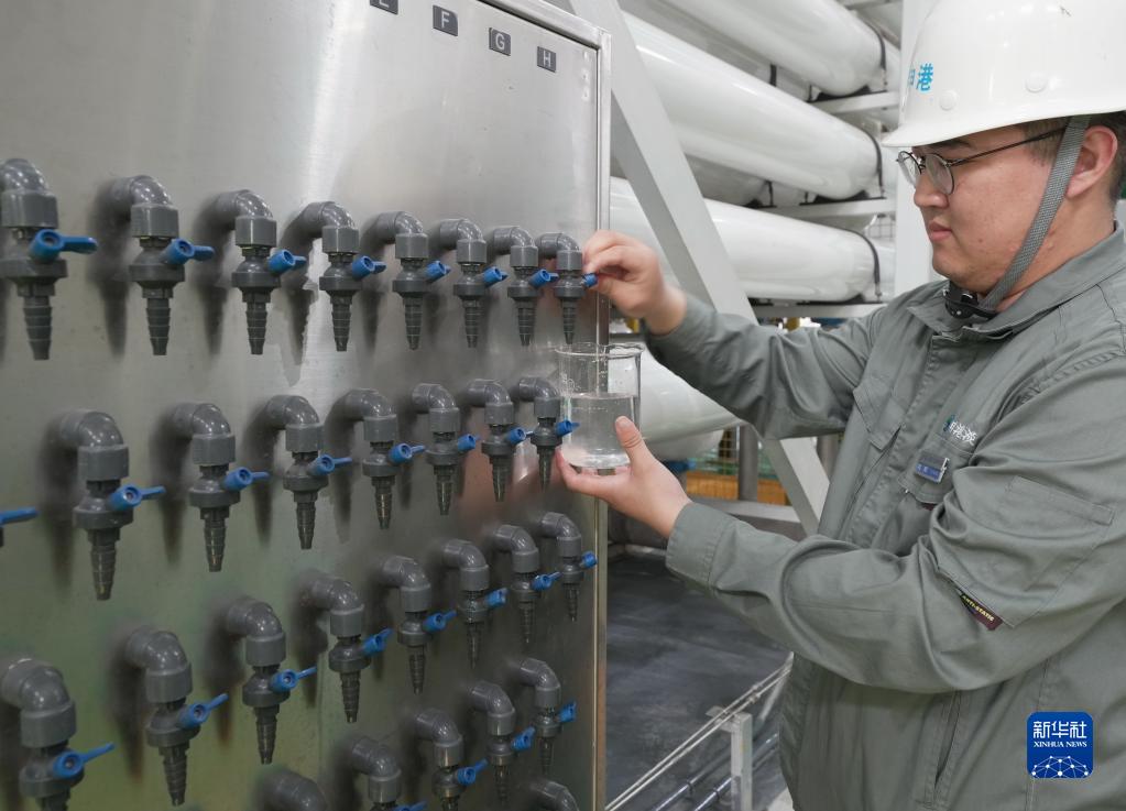 5月25日,工人在唐山市海港經(jīng)濟開(kāi)發(fā)區海水淡化項目投產(chǎn)的淡水生產(chǎn)車(chē)間提取水樣。