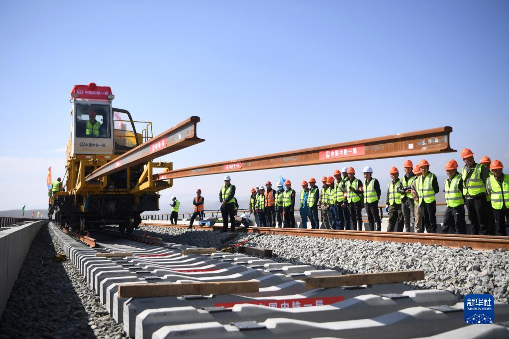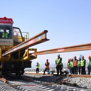 當日,在甘肅省武威市天祝藏族自治縣境內蘭(蘭州)張(張掖)三四線(xiàn)鐵路鋪軌施工現場(chǎng),一體式牽引車(chē)在中鐵一局施工人員的操作下,將一組500米長(cháng)的鋼軌精準鋪設在道床上,標志著(zhù)由中鐵一局承建的蘭張三四線(xiàn)鐵路蘭州至武威段進(jìn)入全線(xiàn)鋪軌階段。