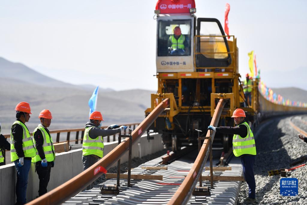 當日,在甘肅省武威市天祝藏族自治縣境內蘭(蘭州)張(張掖)三四線(xiàn)鐵路鋪軌施工現場(chǎng),一體式牽引車(chē)在中鐵一局施工人員的操作下,將一組500米長(cháng)的鋼軌精準鋪設在道床上,標志著(zhù)由中鐵一局承建的蘭張三四線(xiàn)鐵路蘭州至武威段進(jìn)入全線(xiàn)鋪軌階段。