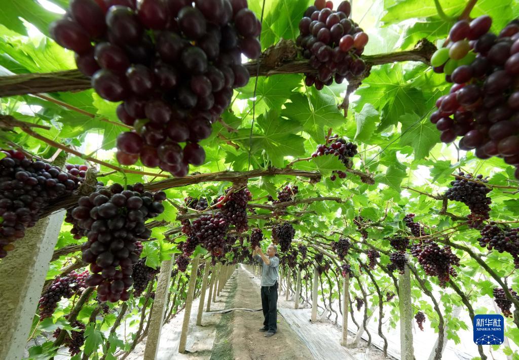 5月26日,唐山市海港經(jīng)濟開(kāi)發(fā)區王灘鎮趙灘村農民在大棚內管護即將成熟的葡萄。