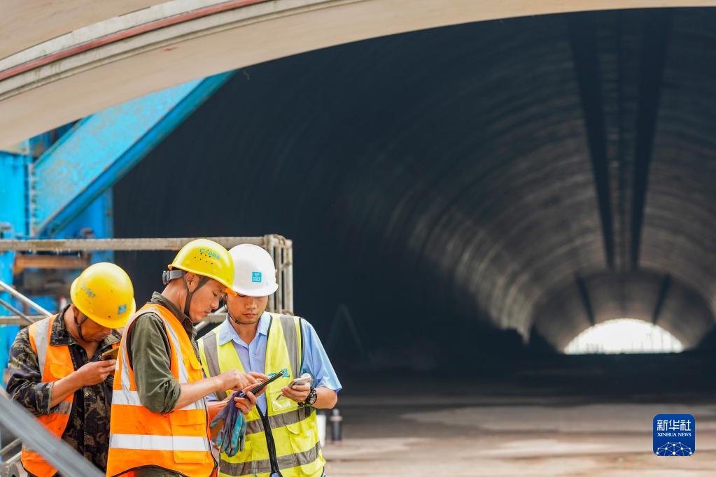 5月26日,技術(shù)人員(右一)和工人在新森大道隧道工程的裝配式拱形隧道施工現場(chǎng)進(jìn)行拼裝作業(yè)的施工技術(shù)交流。