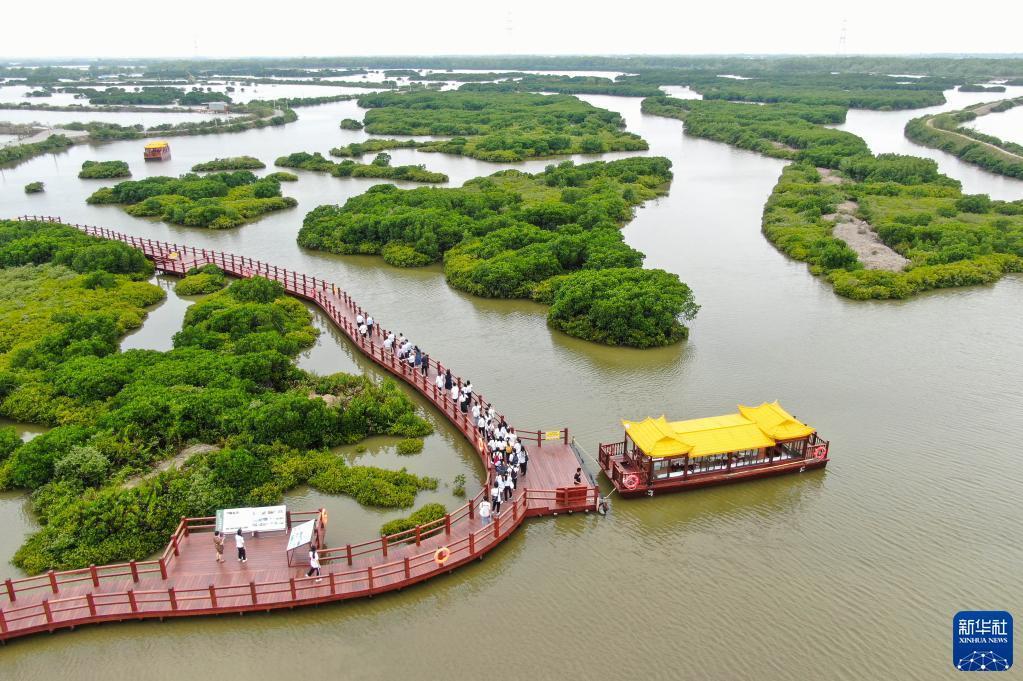 在湛江市金牛島,游客在棧橋上參觀(guān)紅樹(shù)林(5月24日攝,無(wú)人機照片)。
