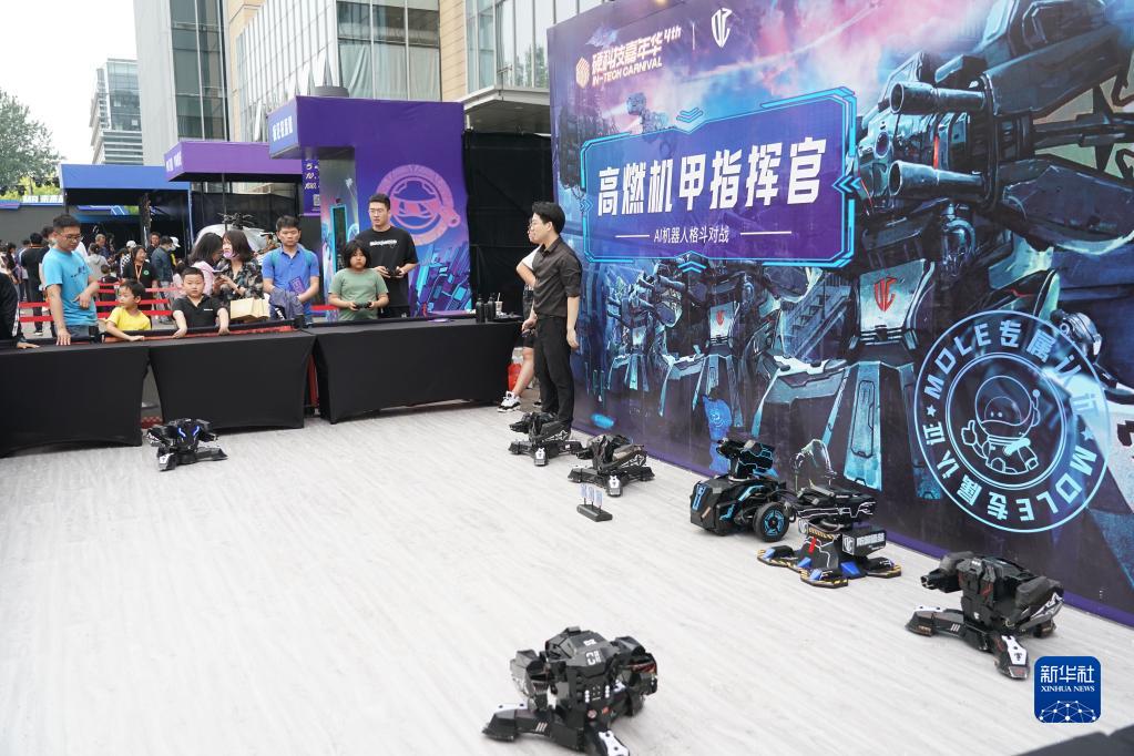 5月27日,觀(guān)眾在硬科技嘉年華中體驗AI機器人格斗對戰。