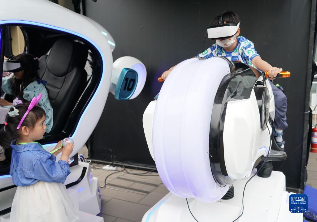 5月27日,一名小朋友在硬科技嘉年華中體驗VR摩托。
