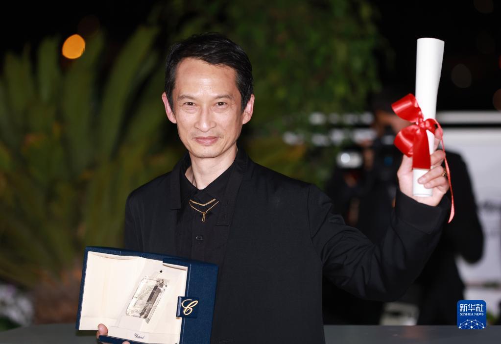 5月27日,在法國戛納,憑借影片《多丹·布法內的欲望》獲得電影節最佳導演獎的越南導演陳英雄展示獎杯。