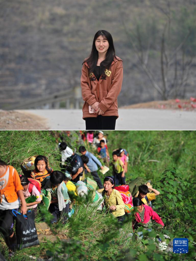 拼版照片:上圖為2023年1月21日,在大化瑤族自治縣板升鄉弄勇村,大專(zhuān)畢業(yè)后在廣州工作的藍秋艷回家過(guò)年時(shí)在家門(mén)口留影;下圖為2012年7月4日,學(xué)校放假后,11歲的藍秋艷(著(zhù)黃衣者)背著(zhù)生活用具,走在回家的山路上。22歲的藍秋艷正在努力考取教師資格證。
