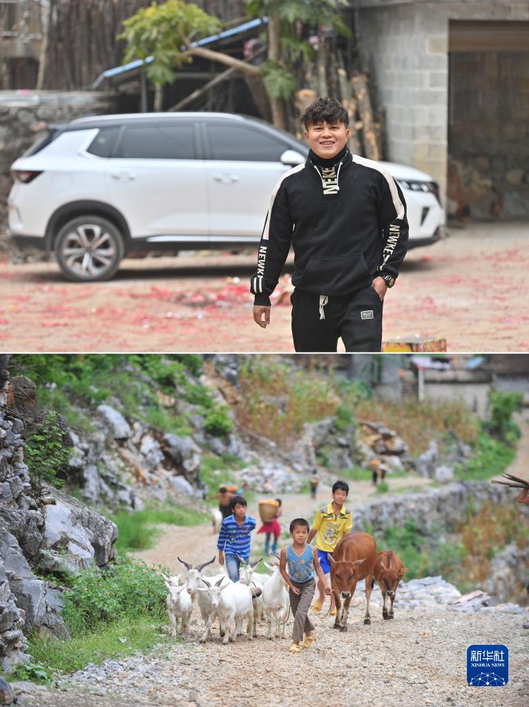 拼版照片:上圖為2023年1月21日,在大化瑤族自治縣板升鄉弄勇村,22歲的蒙宣朝站在自己剛剛購買(mǎi)的汽車(chē)前;下圖為2012年7月16日,在大化瑤族自治縣板升鄉弄勇村,11歲的蒙宣朝(前)利用暑假幫家里放牧。技校畢業(yè)后,蒙宣朝到廣東工作。