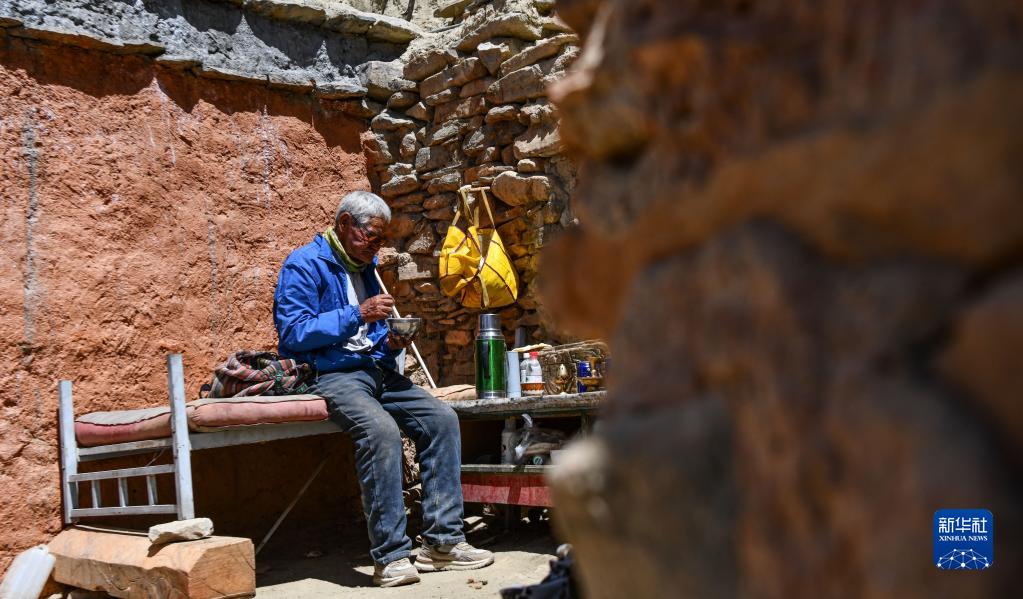 仁增旺扎老人在石窟旁吃午飯(5月26日攝)。