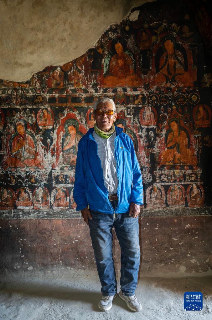 5月26日,仁增旺扎老人在皮央石窟的壁畫(huà)前留影。
