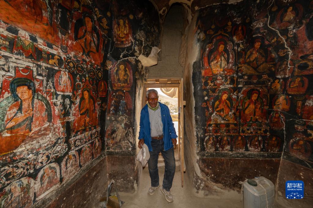 5月26日,仁增旺扎老人走進(jìn)繪滿(mǎn)壁畫(huà)的石窟。