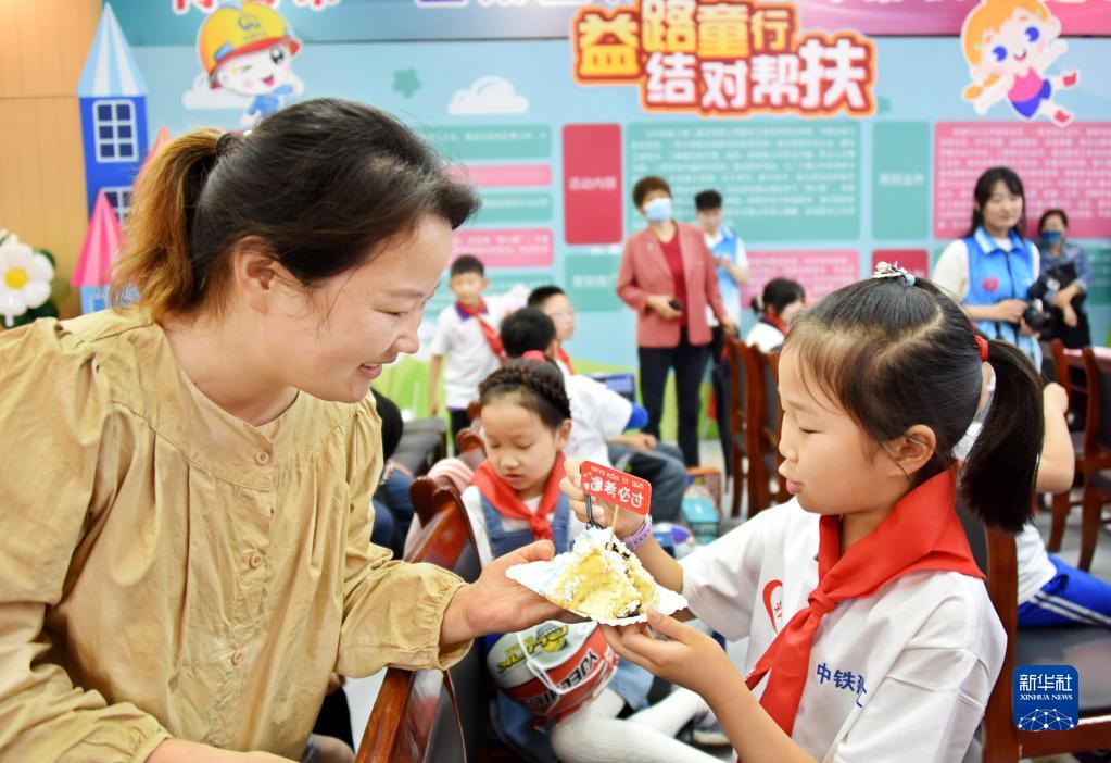 5月28日,小朋友在聯(lián)歡活動(dòng)上與媽媽分享蛋糕。